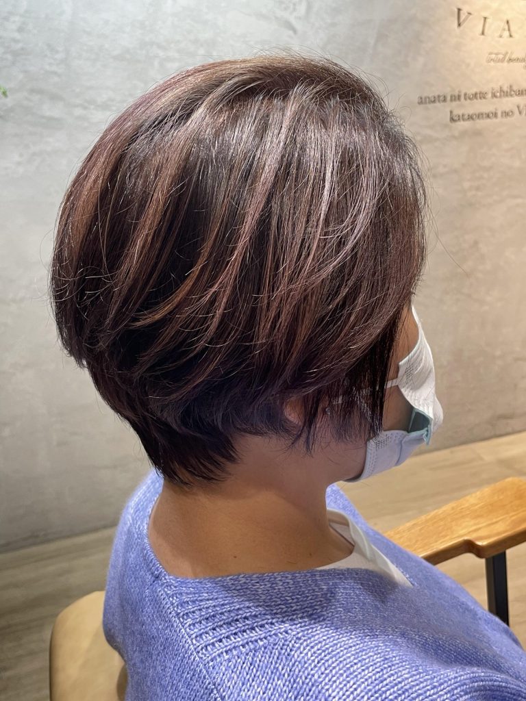 A : 派手になりません。かなり細いハイライトを髪の毛に対して入れますスタイルや白髪量・希望のお色味などで多少変わりますが抜けた後で下品な色になったり、パサついて見えるような色にはなりません